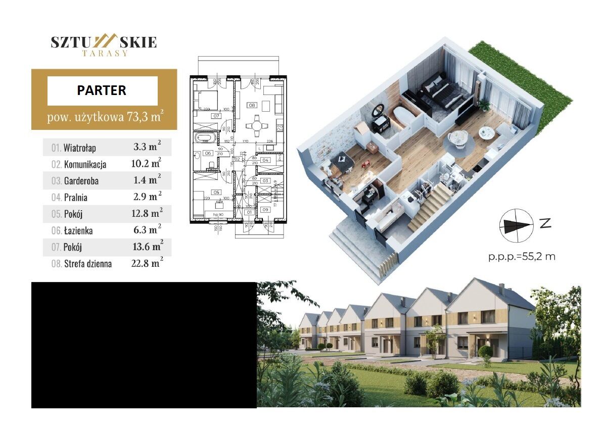 To parterowe mieszkanie zgodnie ze specyfikacją ma powierzchnię 73,3 m2 i zawiera :