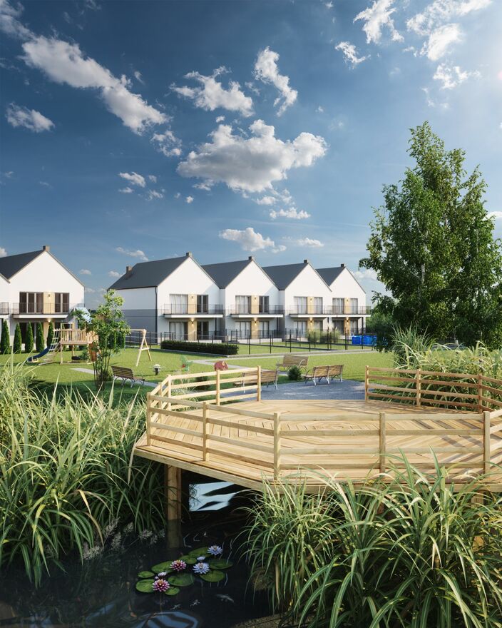 Lokalizacja tego niewielkiego osiedla pozwala wrócić po całym zgiełku codziennego pracowitego dnia do przestrzeni , która wprowadza relaks , spokój i napawa pięknem krajobrazu pobliskiej przyrody bezpośrednio z ogrodowego tarasu. Na swój własny ogrodzony ogródek położony blisko jeziora o powierzchni 100m2 można oczywiście wyjść bezpośrednio zarówno ze strefy dziennej mieszkania jak i z sypialni ( patrz plan lokalu w galerii ) .